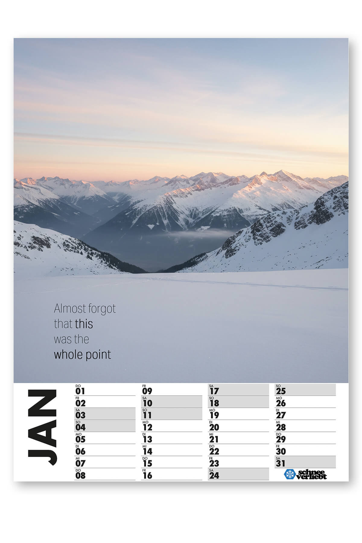 Aktuell sind die Motive noch im Feinschliff, aber eine erste Vorschau auf drei Monate könnt ihr schon sehen. Der Rest wird noch nicht verraten. Also lasst euch überraschen, welche Bilder und Sprüche es dieses Mal in den Kalender schaffen. Ihr könnt euch auf jeden Fall auf 12 Bergbilder mit Spruch freuen. Und natürlich hat jedes Monatsblatt auch wieder Platz um wichtige Termine, wie beispielsweise den nächsten Winterurlaub, einzutragen.